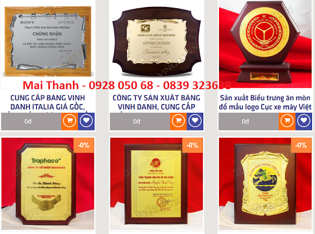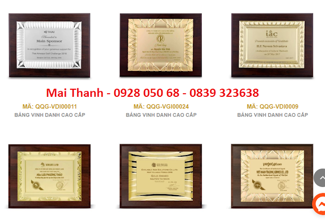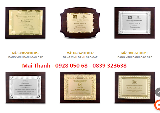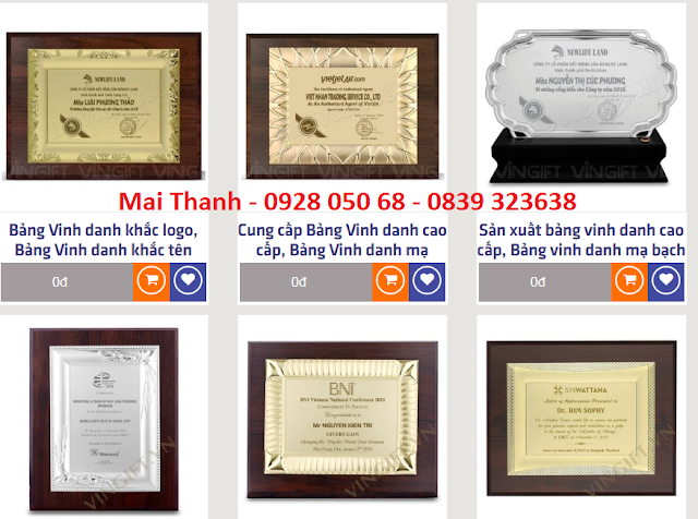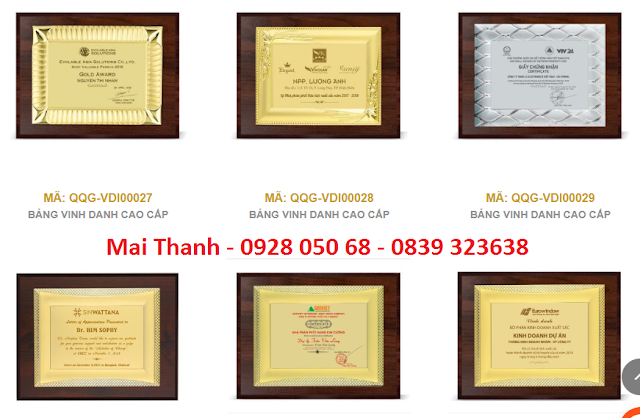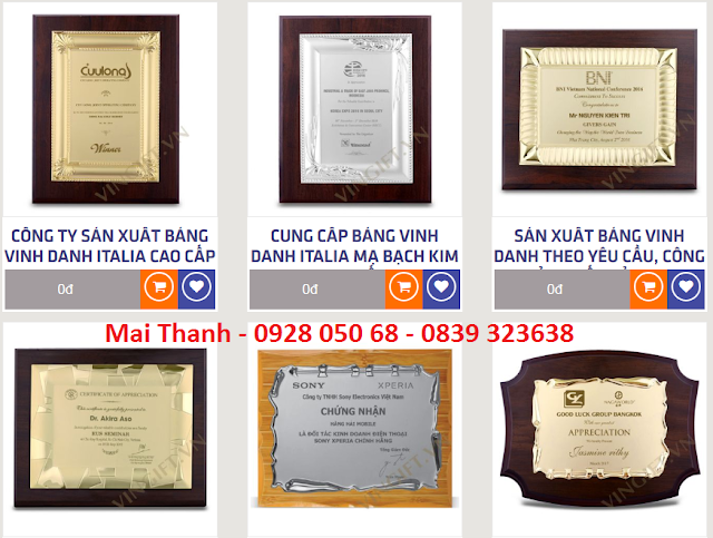 Xưởng sản xuất bảng vinh danh, bằng chứng nhận, kỷ niệm chương gỗ đồng,cung cấp bằng chứng nhận đại lý, nơi làm bảng vàng CÔNG TY QUÀ TẶNG QUỐC GIA (VINGIFT) là công ty chuyên nghiệp trong lĩnh vực tư vấn thiết kế, sản xuất Quà tặng cao cấp tại Việt Nam.Sản phẩm của VINGIFT được chế tác tinh sảo trên vật liệu như: Đồng, Sắt, Nhôm, Hợp kim, Pha lê, Thủy tinh, Gỗ, Gốm sứ, Nhựa... Để đạt được độ tinh sảo cao trên các sản phẩm quà tặng VINGIFT đã chú trọng đầu tư công nghệ, máy móc hiện đại nhất hiện nay nhằm phục vụ việc gia công các sản phẩn Quà tặng ngay trong nước. Ngoài ra VINGIFT còn hợp tác với rất nhiều đối tác nước ngoài để nhập khẩu những sản phẩm Quà tặng độc đáo mà trong nước không thể sản xuất được để đưa đến tay Khách hàng. Chính vì vậy VINGIFT tin tưởng sẽ mang đến cho khách hàng những sản phẩm làm Quà tặng ưng ý, sang trọng, giá thành tốt nhất.Sản phẩm của VINGIFT phục vụ cho: - Lễ kỷ niệm ngày thành lập Cơ quan, doanh nghiệp. - Hội thảo, hội nghị khách hàng. - Đại hội thể dục thể thao, Đại hội khối cơ quan, doanh nghiệp.- Quà tặng cho đối tác nước ngoài. - Quà tặng phục vụ quảng bá thương hiệu.- Quà tặng Vinh danh cán bộ nhân viên Mai Thanh - Mobile : 0928 050 586 - 0839323638 Điện thoại: 024.85 85 2468